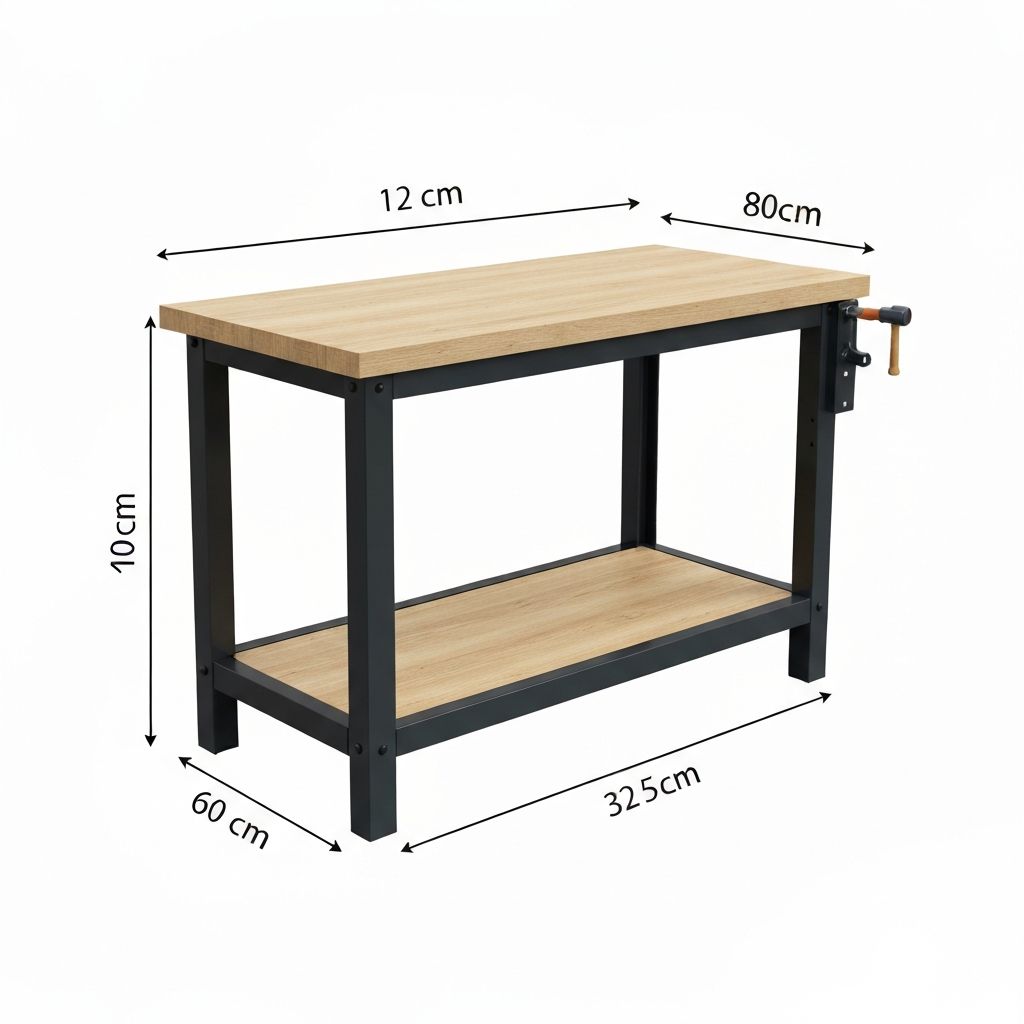 Mesas, bancos de trabajo, estantes, armarios y estructuras metálicas con medidas y lista de materiales.